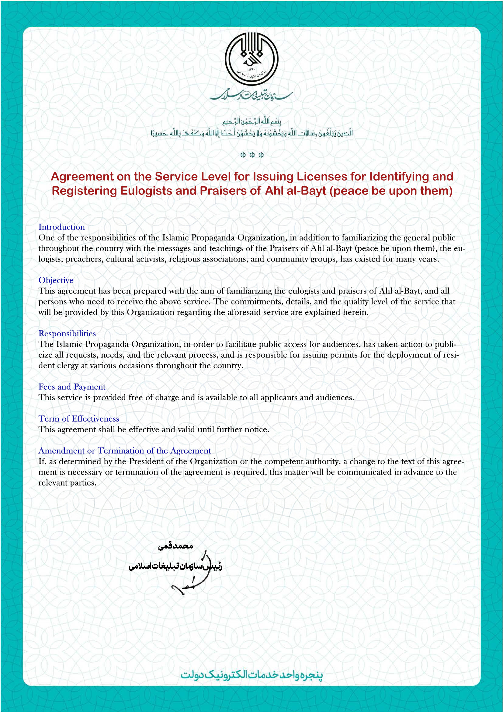 This service aims to issue official identification cards for eulogists and reciters who perform praise and lamentation for Ahl al-Bayt (peace be upon them), in order to formally recognize their role, facilitate their organization and authentication, and enable them to access relevant programs, permissions, and support services as needed.