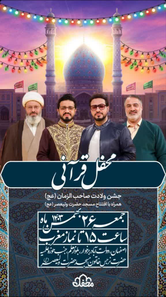 به گزارش روابط عمومی سازمان تبلیغات اسلامی، پس از محفل بزرگ قرآنی در مسجد مقدس جمکران، به مناسبت میلاد با سعادت حضرت ولیعصر(عج) محفل قرآنی امام زمانیها با حضور میزبانان برنامه محفل، در مسجد حضرت ولیعصر (عج) اصفهان برگزار میشود.