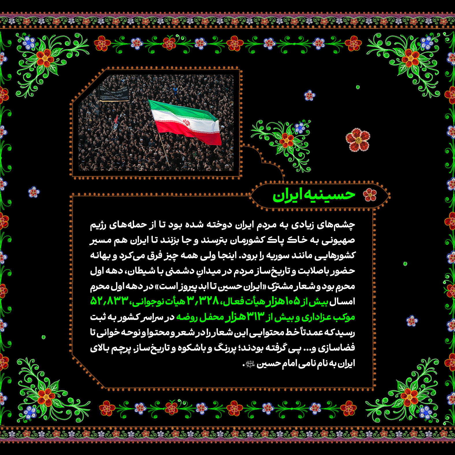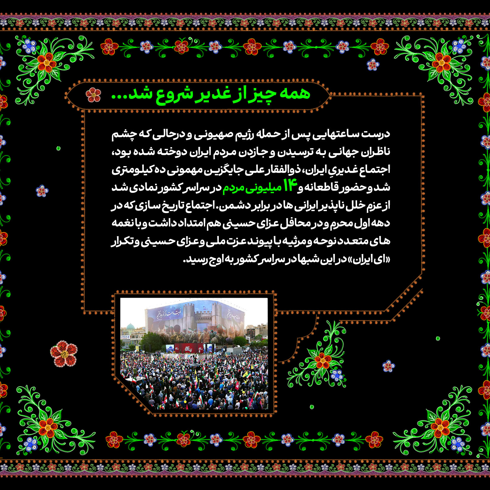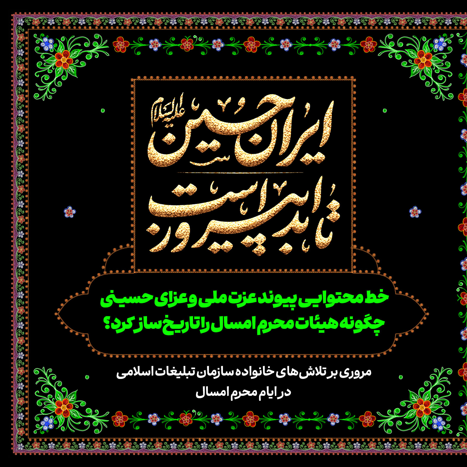 تاریخسازی مردم ایران در ماه محرم امسال تماشایی و پر افتخار بود. مسیری که در روز عید غدیر و درست ساعاتی پس از حمله رژیم صهیونیستی به خاک کشورمان با حضور قاطعانه و ۱۴ میلیونی در راهپیمایی ایران ذوالفقار علی در سراسر کشور آغاز شد و با برگزاری پرشور هیئات محرمی به اوج رسید؛ پیوندی از آیین ایرانی و مکتب حسینی با شعار «ایران حسین تا ابد پیروز است». در این شماره از نشریه دیجیتال مروری کردهایم بر تلاشهای خانواده سازمان تبلیغات اسلامی در ماه محرم امسال.