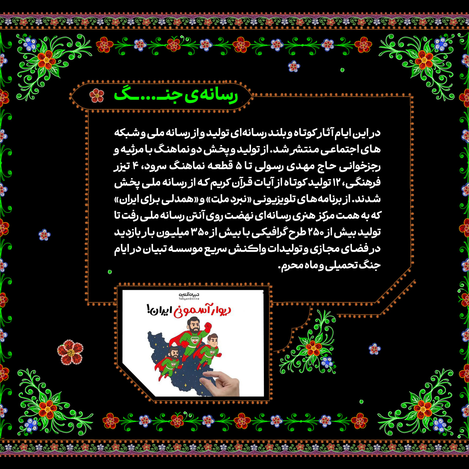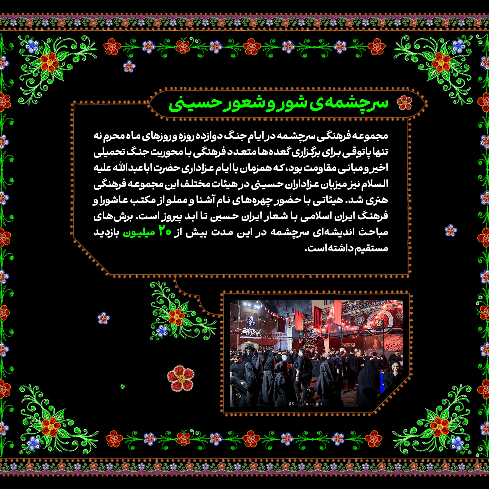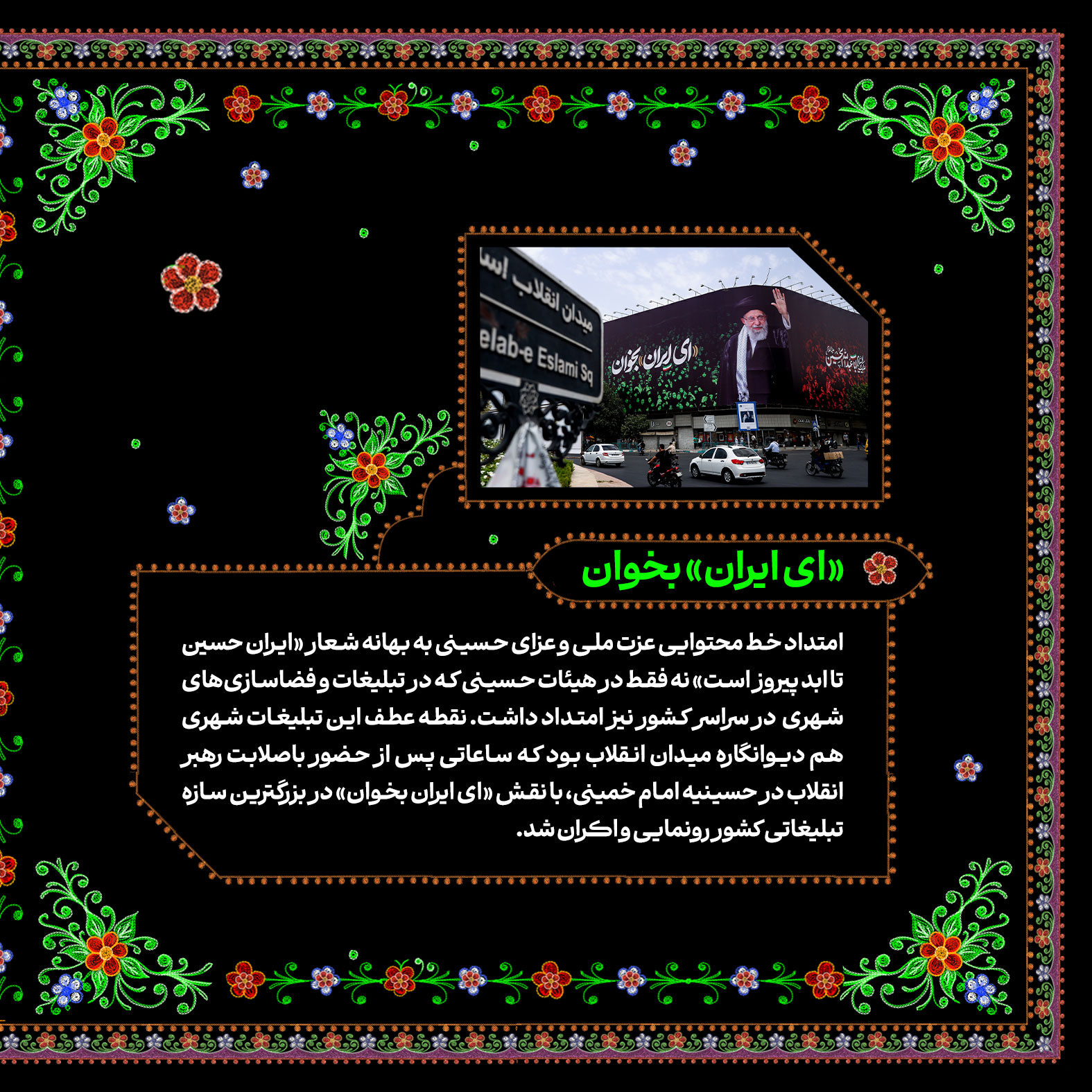 تاریخسازی مردم ایران در ماه محرم امسال تماشایی و پر افتخار بود. مسیری که در روز عید غدیر و درست ساعاتی پس از حمله رژیم صهیونیستی به خاک کشورمان با حضور قاطعانه و ۱۴ میلیونی در راهپیمایی ایران ذوالفقار علی در سراسر کشور آغاز شد و با برگزاری پرشور هیئات محرمی به اوج رسید؛ پیوندی از آیین ایرانی و مکتب حسینی با شعار «ایران حسین تا ابد پیروز است». در این شماره از نشریه دیجیتال مروری کردهایم بر تلاشهای خانواده سازمان تبلیغات اسلامی در ماه محرم امسال.