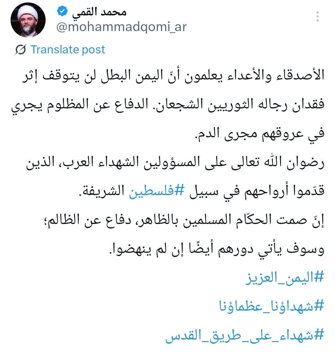 به گزارش روابط عمومی سازمان تبلیغات اسلامی، حجتالاسلام محمد قمی، رئیس سازمان تبلیغات اسلامی برای گرامیداشت یاد احمد غالب الرهوی، نخستوزیر مجاهد و دیگر دولتمردان شهید یمن سربلند و مقاوم در صفحه شخصی خود در شبکه اجتماعی ایکس برای مخاطبان عرب زبان نوشت؛