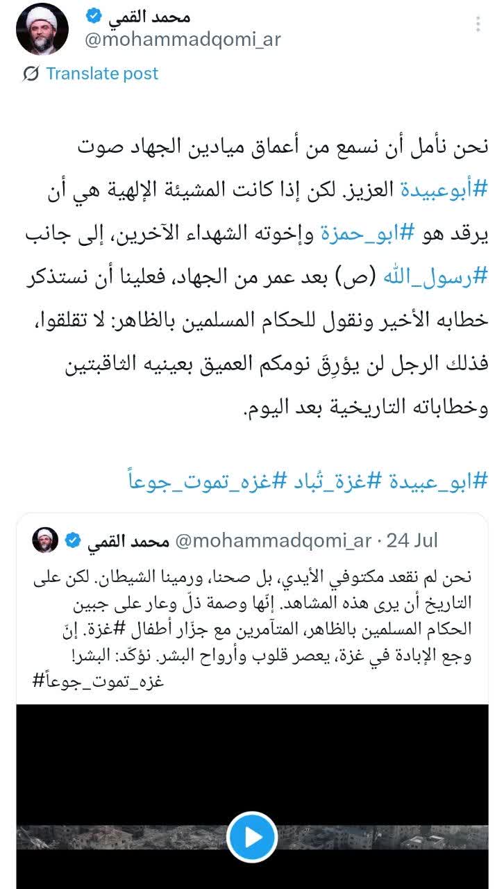 به گزارش روابط عمومی سازمان تبلیغات اسلامی، حجتالاسلام محمد قمی، رئیس سازمان تبلیغات اسلامی در صفحه شخصی خود در شبکه اجتماعی ایکس به یاد سخنگوی مجاهد گردانهای شهید عزّالدین قسّام، با انتشار آخرین خطابه او در محکومیت بیعملی حاکمان کشورهای اسلامی به زبان عربی نوشت؛