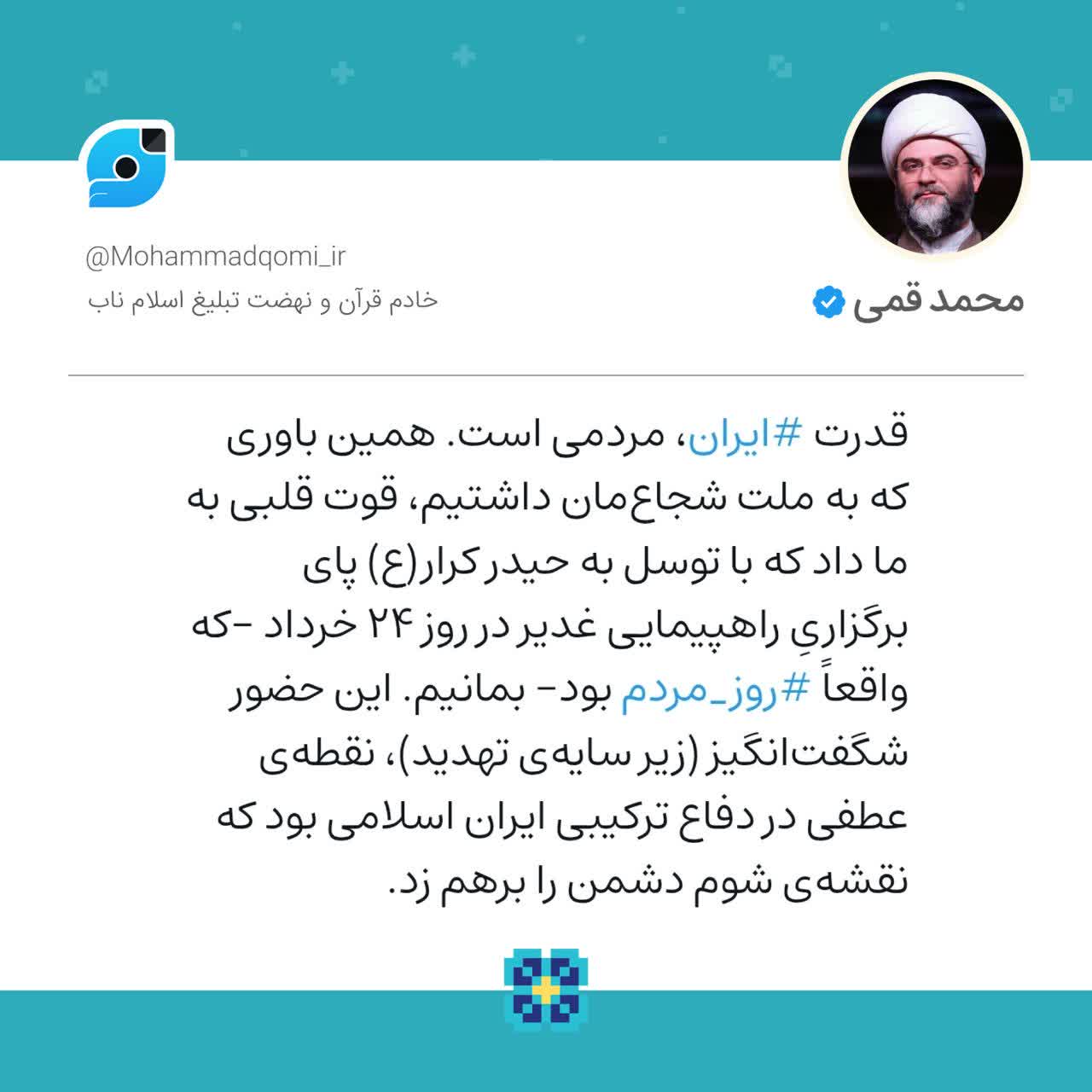 به گزارش روابط عمومی سازمان تبلیغات اسلامی، حجتالاسلام محمد قمی، رئیس سازمان تبلیغات اسلامی در صفحه شخصی خود در شبکه اجتماعی ویراستی بعد از سخنرانی تلویزیونی شب گذشتهی رهبر معظم انقلاب خطاب به ملت ایران که در جریان آن، با اشاره به حضور چشمگیر و تاریخی مردم در خیابانهای شهرهای سراسر کشور در روزهای ۲۳ و ۲۴ خرداد (بعد از نماز جمعه و در اجتماع غدیرِ روز شنبه) اشاره کردند نوشت؛
